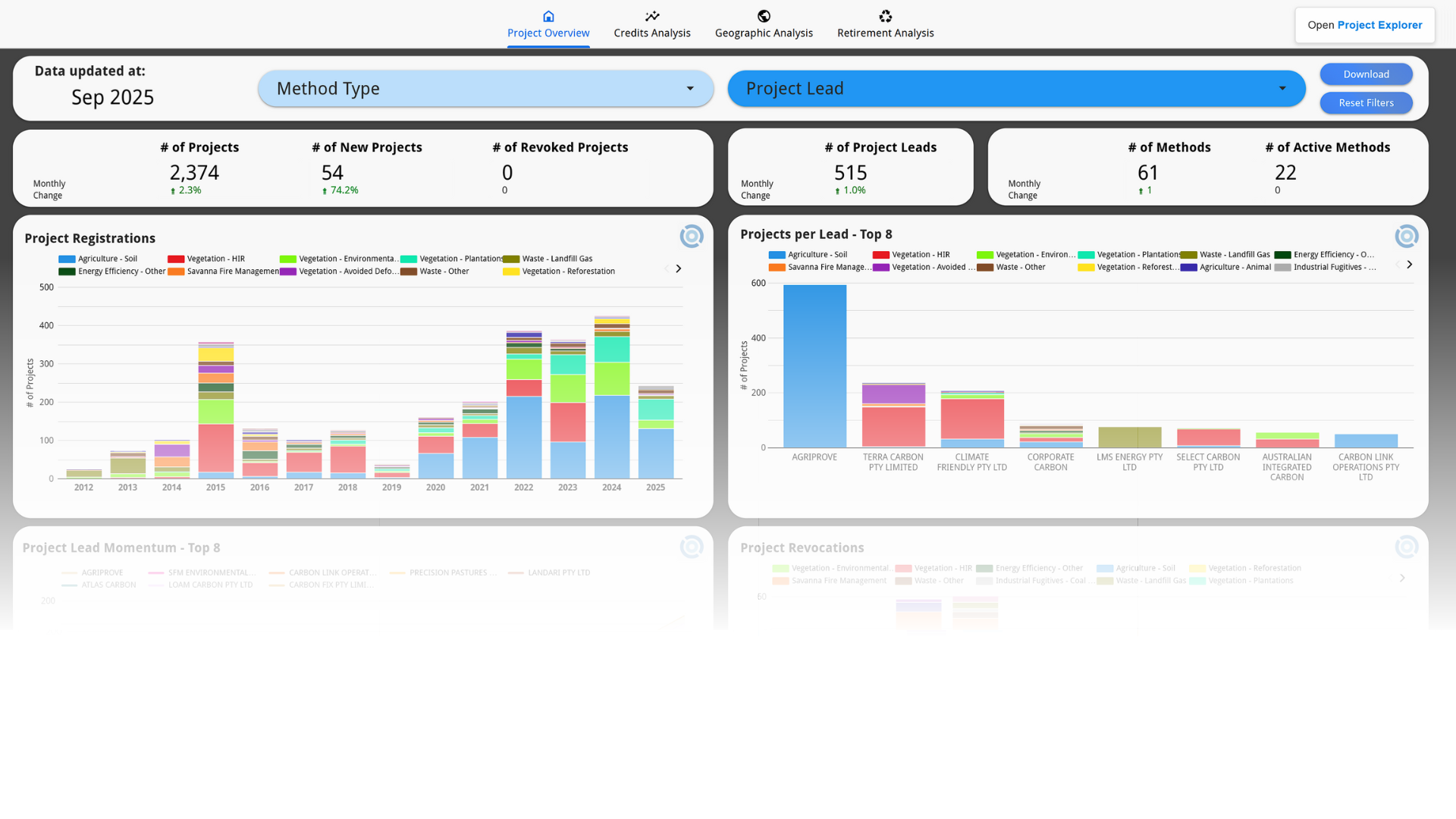 Tracks total projects, new registrations, revoked projects and project methods.