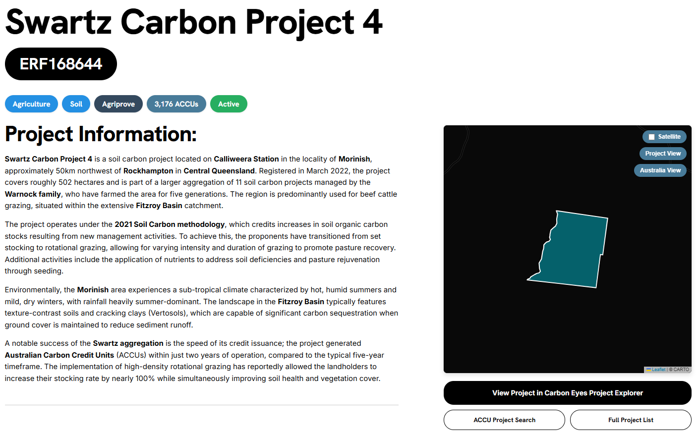 “Environmental conditions in the Banana Shire are characterized by a semi-arid to subtropical climate. The project uses rotational grazing, improved water infrastructure and pasture rejuvenation used to increase SOC.”