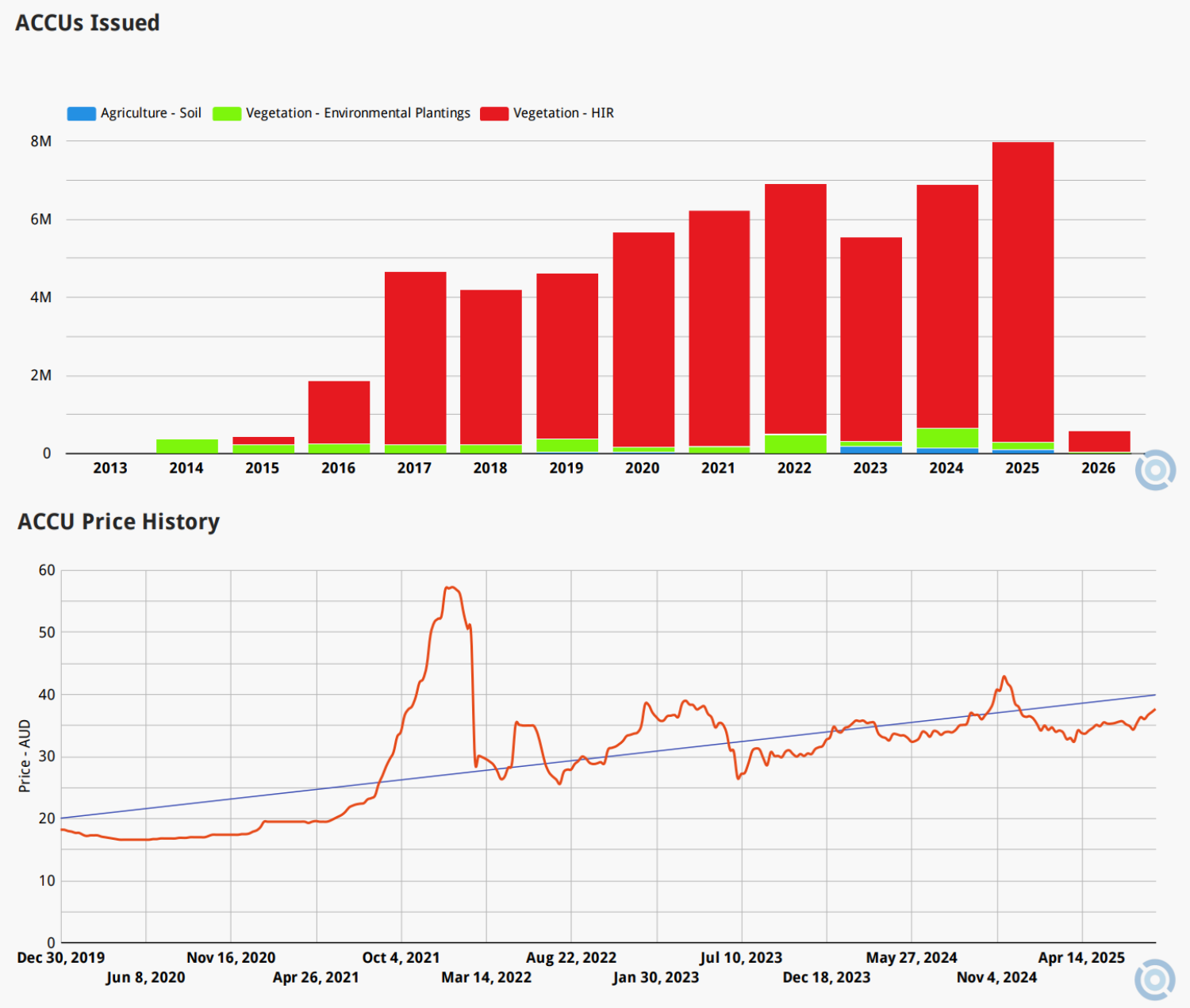 Environmental plantings are a different beast. Most EP projects were registered years ago and now deliver credits consistently. They’re long-lived, steady and trusted, even if new registrations have slowed.